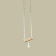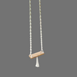 A handcrafted Balinese style white macrame swing with a solid wooden seat, designed with intricate patterns and tassels.